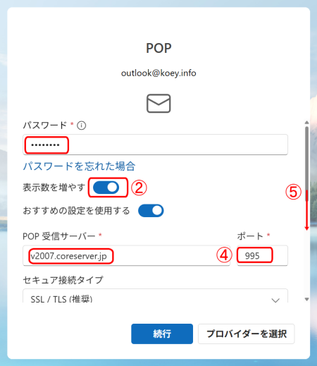 ③「pop受信サーバー」の欄に「v2007.coreserver.jp」を入力します。