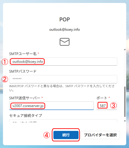 ①「SMTPユーザー名」の欄にメールアドレスを入力します。